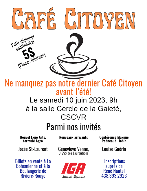 Inscrivez-vous au prochain Café Citoyen qui aura lieu le samedi 10 juin de 9h à midi au Centre sportif et culturel de la Vallée de la Rouge. Bienvenue à toutes et à tous!